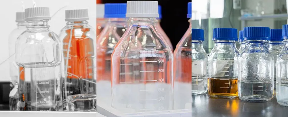 Tá buidéil imoibrí gloine le scriú de ghnáth i dath ómra nó soiléir, is féidir scriú a bheith i dath gorm nó oráiste. De ghnáth, tugtar buidéal meáin ar bhuidéal imoibrí gloine le caipín scriú, cuid acu le O-ring.